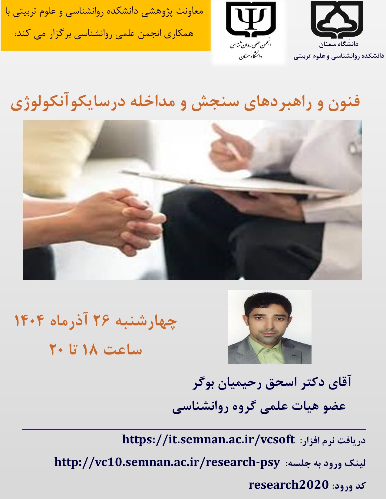 سخنرانی علمی آقای دکتر رحیمیان با عنوان فنون و راهبردهای سنجش و مداخله در سایکوآنکولوژی 1404/09/25 - 13:49 تعداد بازدید: 51 کلمات کلیدی