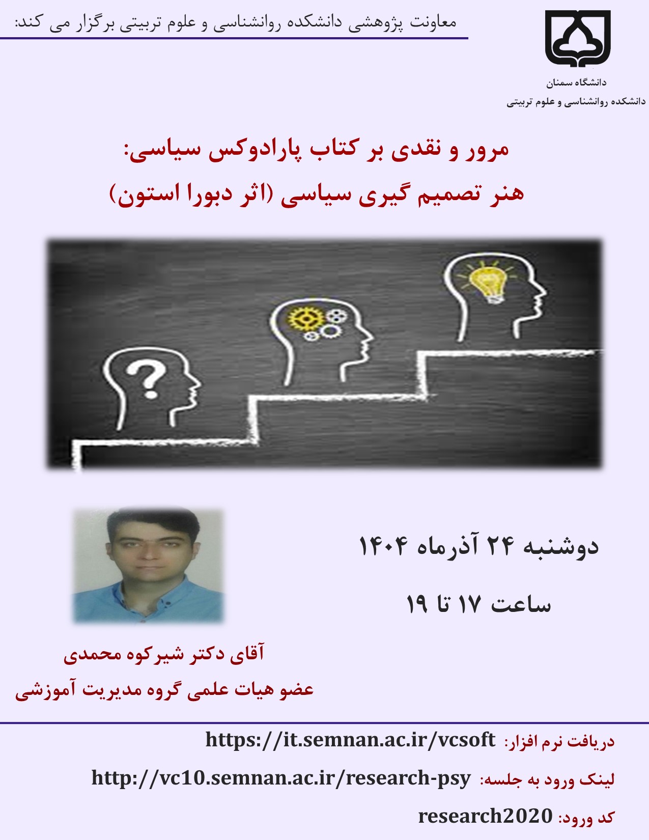 سخنرانی علمی جناب آقای دکتر محمدی با عنوان مرور و نقدی بر کتاب پارادوکس سیاسی هنر تصمیم گیری سیاسی (اثر دبورا استون) 1404/09/23 - 13:44 تعداد بازدید: 27 کلمات کلیدی