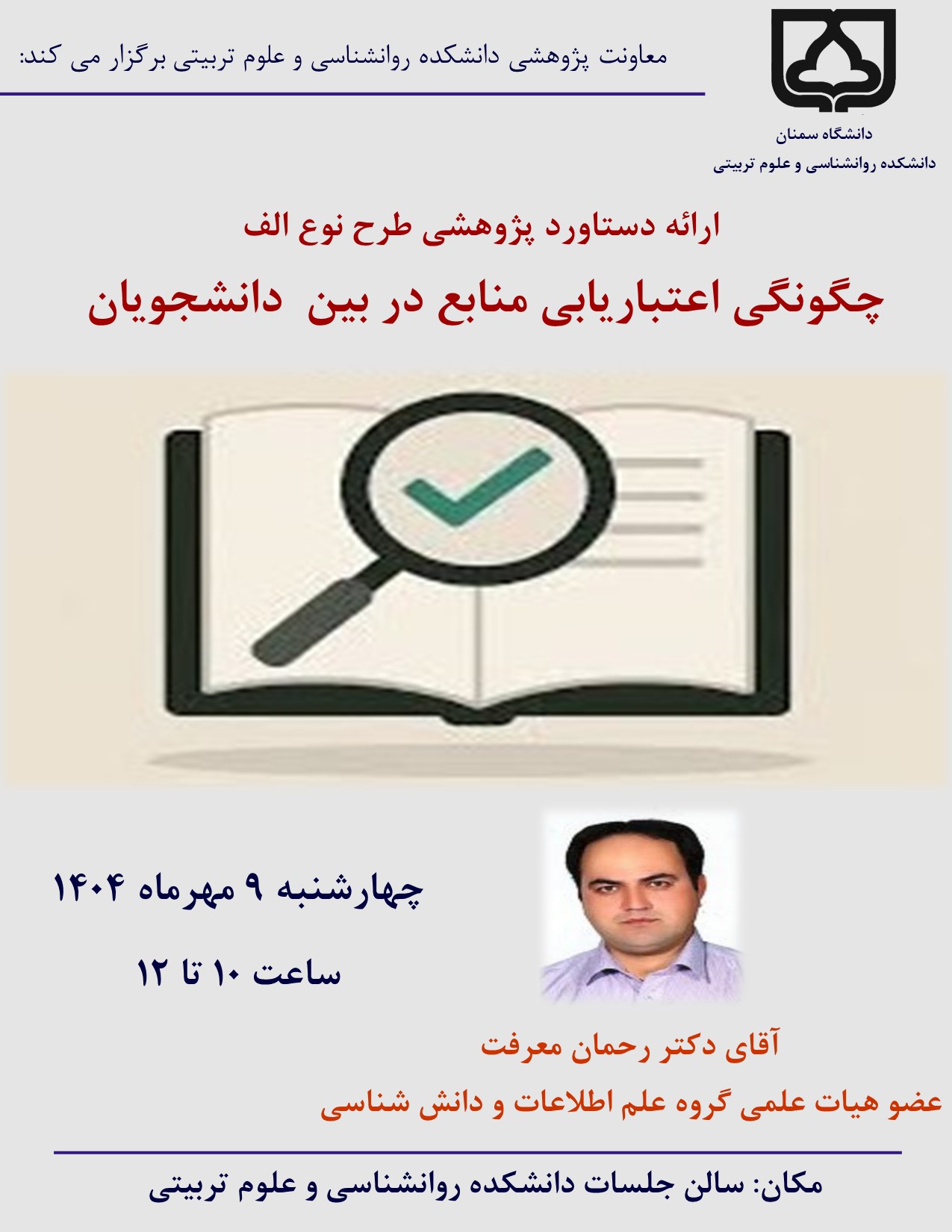 ارائه دستاورد پژوهشی طرح نوع الف آقای دکتر رحمان معرفت با عنوان چگونگی اعتباریابی منابع در بین دانشجویان 1404/07/08 - 14:08 تعداد بازدید: 251 کلمات کلیدی